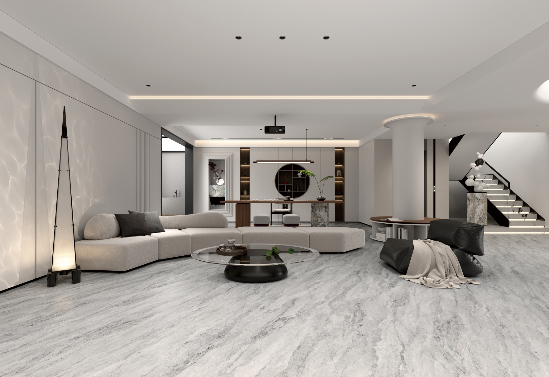 剛?cè)岵?jì)的灰色和凹凸立體的肌理質(zhì)感,在光影交錯(cuò)中更顯層次豐富;細(xì)膩交織的白色石紋悠然貫穿于灰色基底之上,與灰調(diào)自然相融,宛如清澈溪流輕盈穿梭于石隙之間,靈動(dòng)而寧?kù)o。
