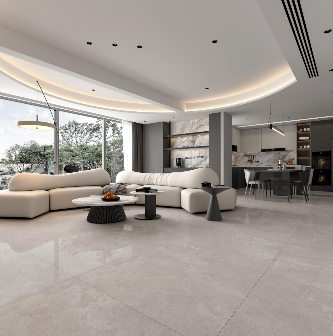 獨(dú)特時尚的米杏色調(diào),變幻莫測的漸變紋理流動,彷如歲月的雕琢,給空間帶來連貫、完整、延伸的無垠視界。